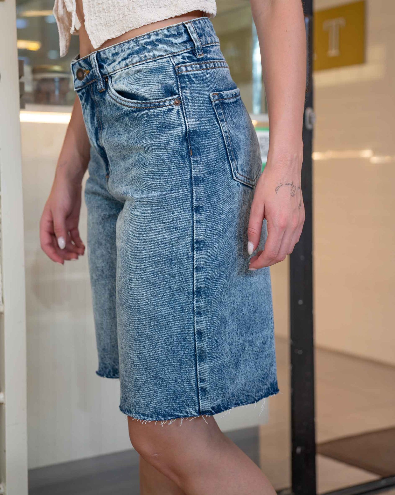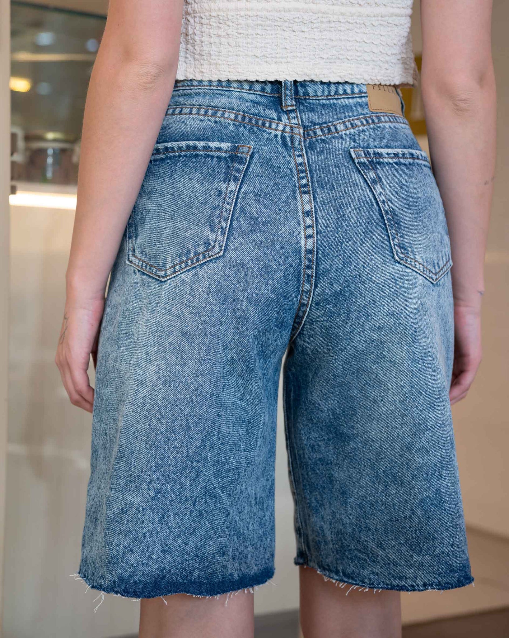 Bermuda tiro alto en tela rígida, silueta amplia. Ideal para armar tus outfits. Maria Fernanda usa una bermuda talla 8 y mide 1.72 cm.