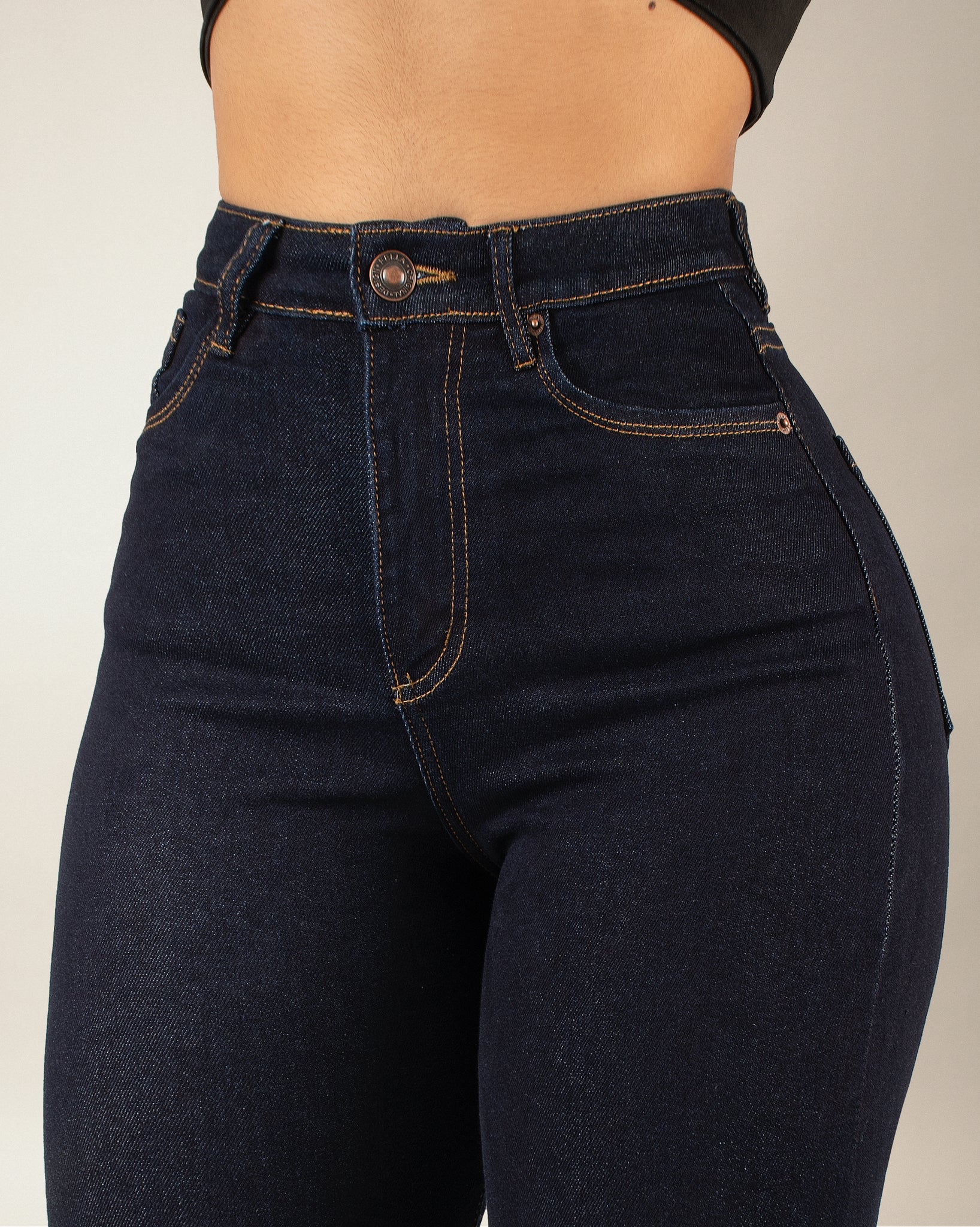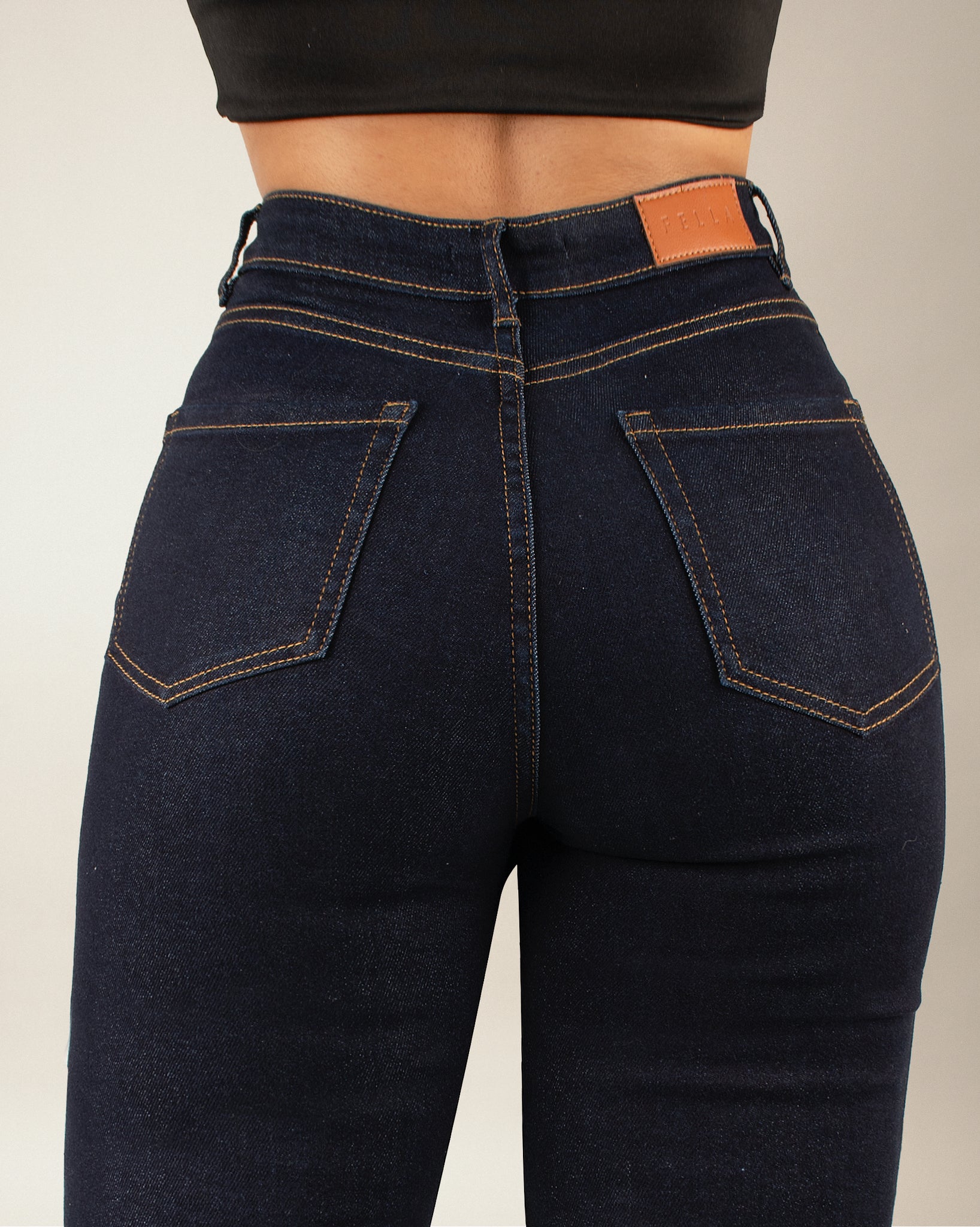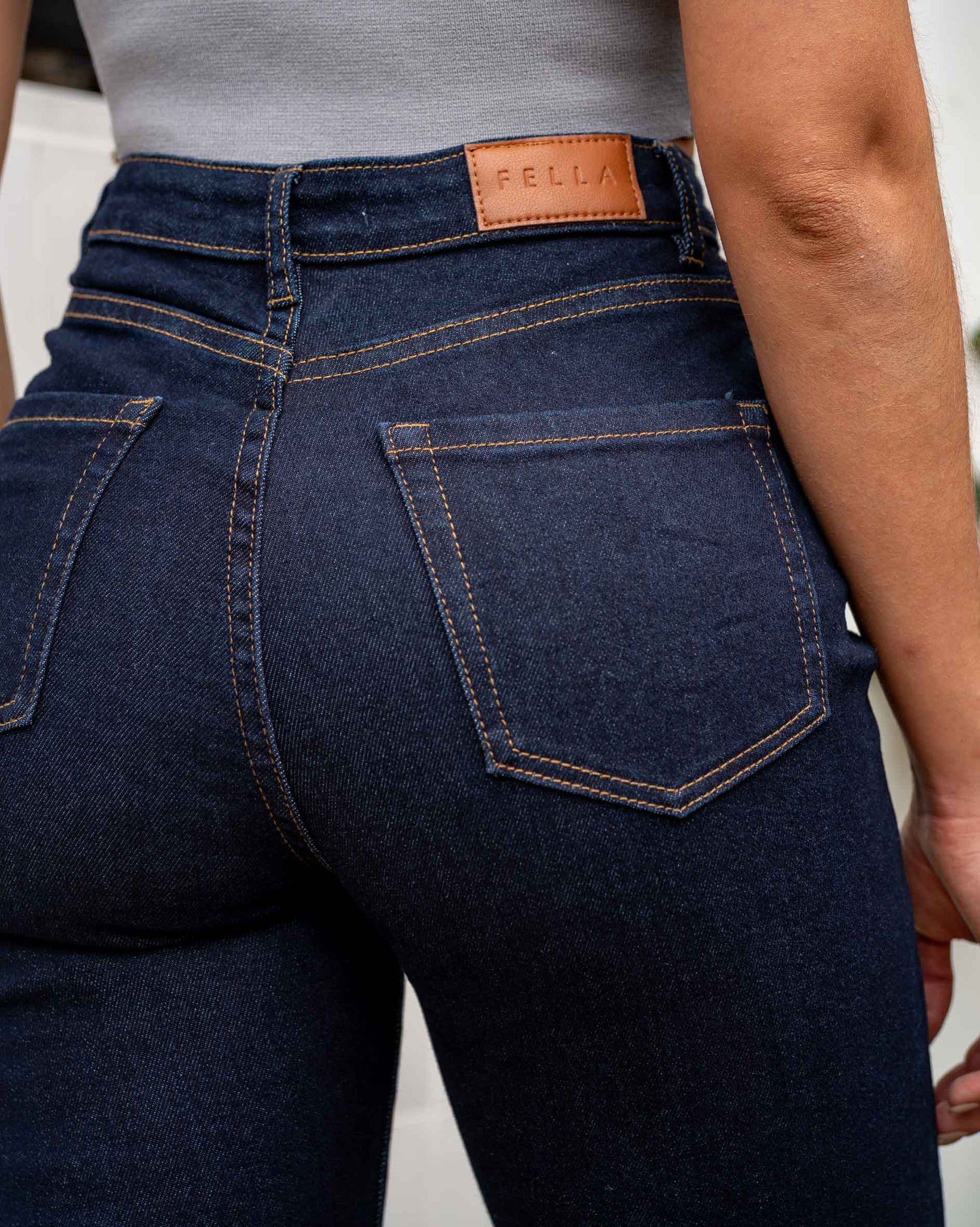 Jean tiro alto en tela stretch con silueta tipo "mom flare". Ideal para armar tus outfits. Maria Fernanda usa un jean talla 8 y mide 1.72 cm.