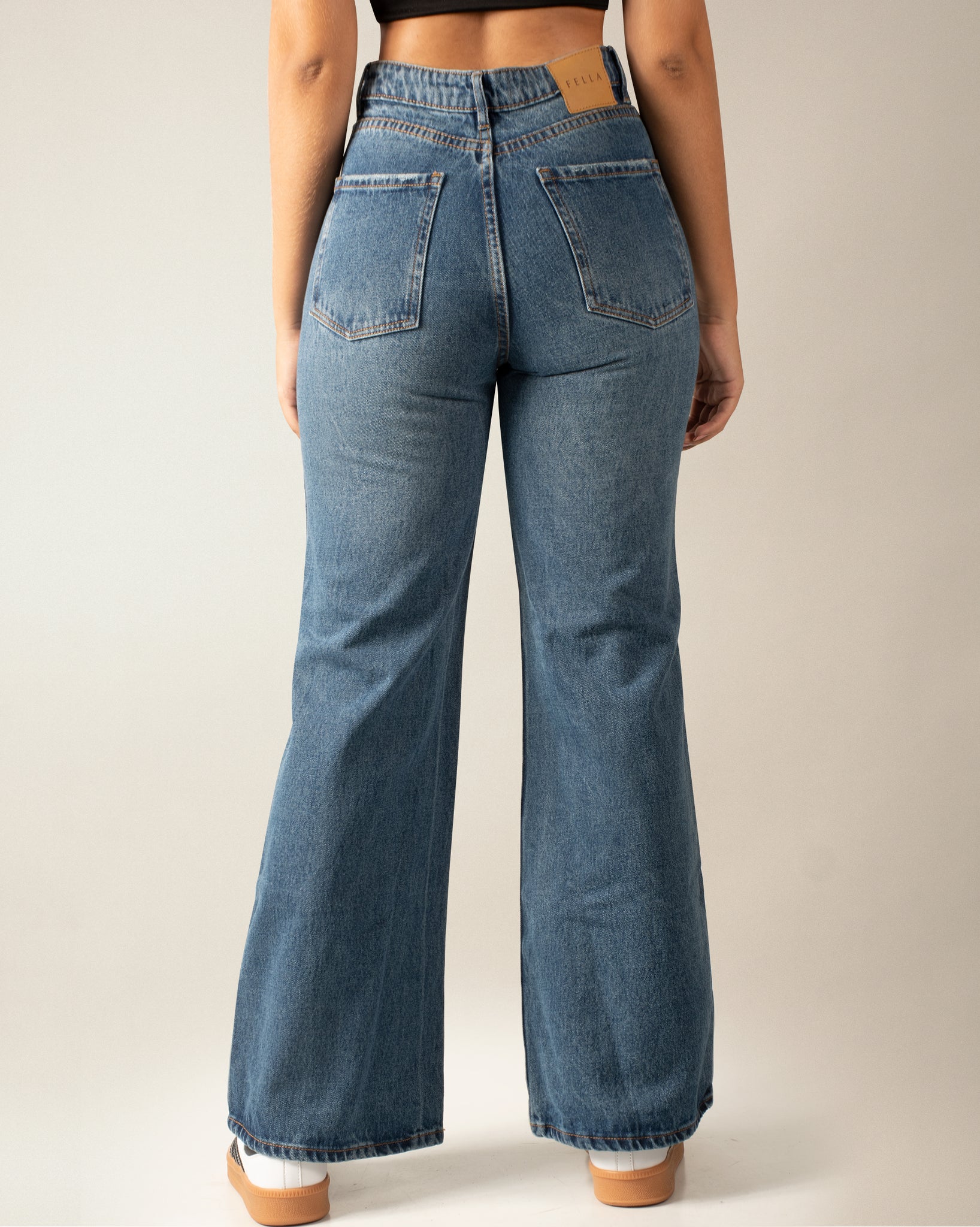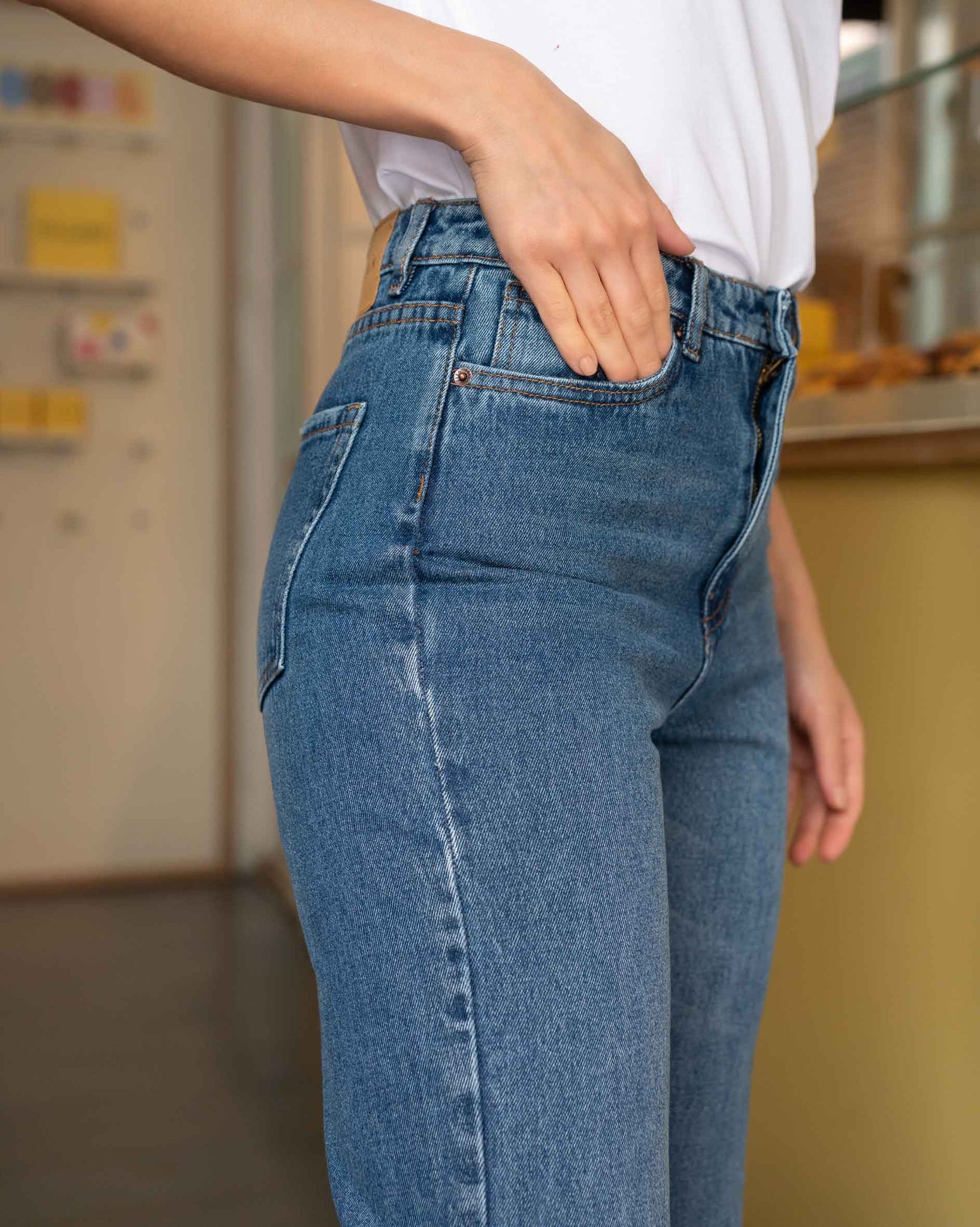 Jean tiro alto en tela rígida, silueta tipo "mom flare". Ideal para armar tus outfits. Maria Fernanda usa un jean talla 8 y mide 1.72 cm.