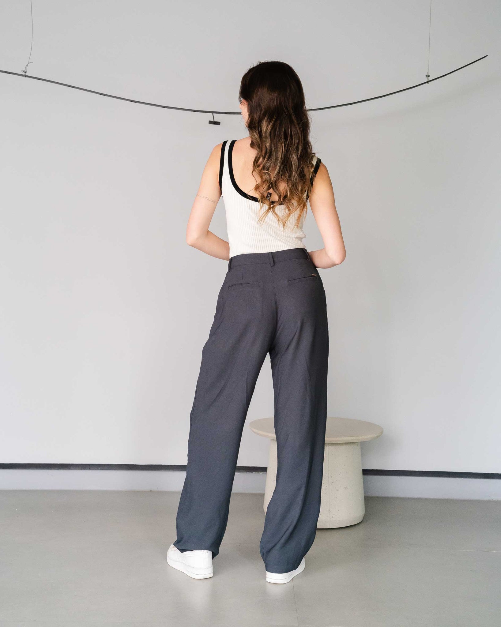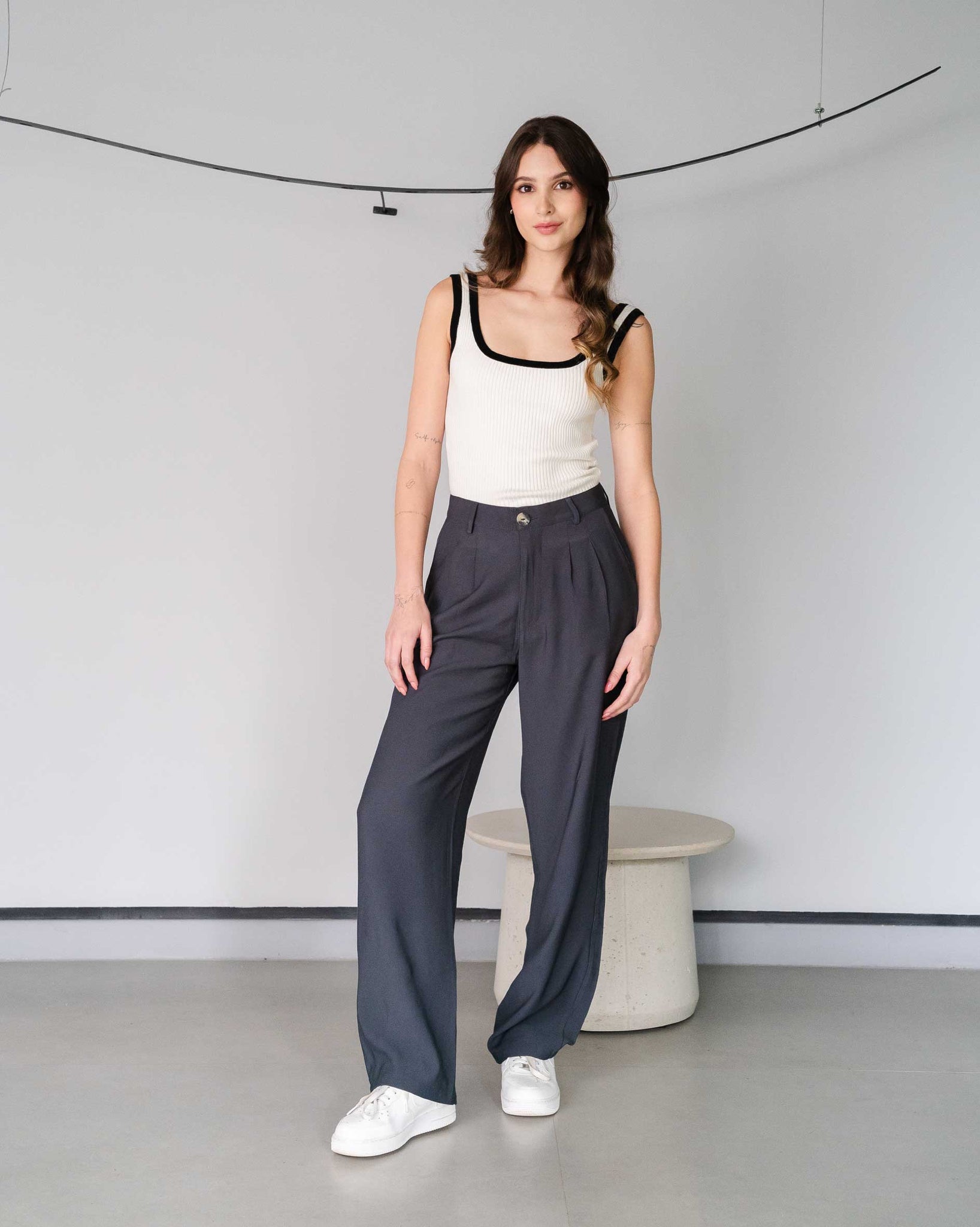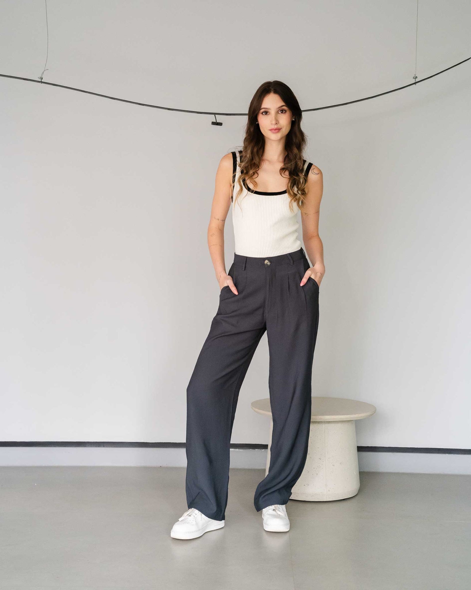 Pantalón tiro alto en tela rígida liviana con silueta tipo "straight". Ideal para armar tus outfits. Maria Fernanda usa un jean talla 8 y mide 1.72 cm.