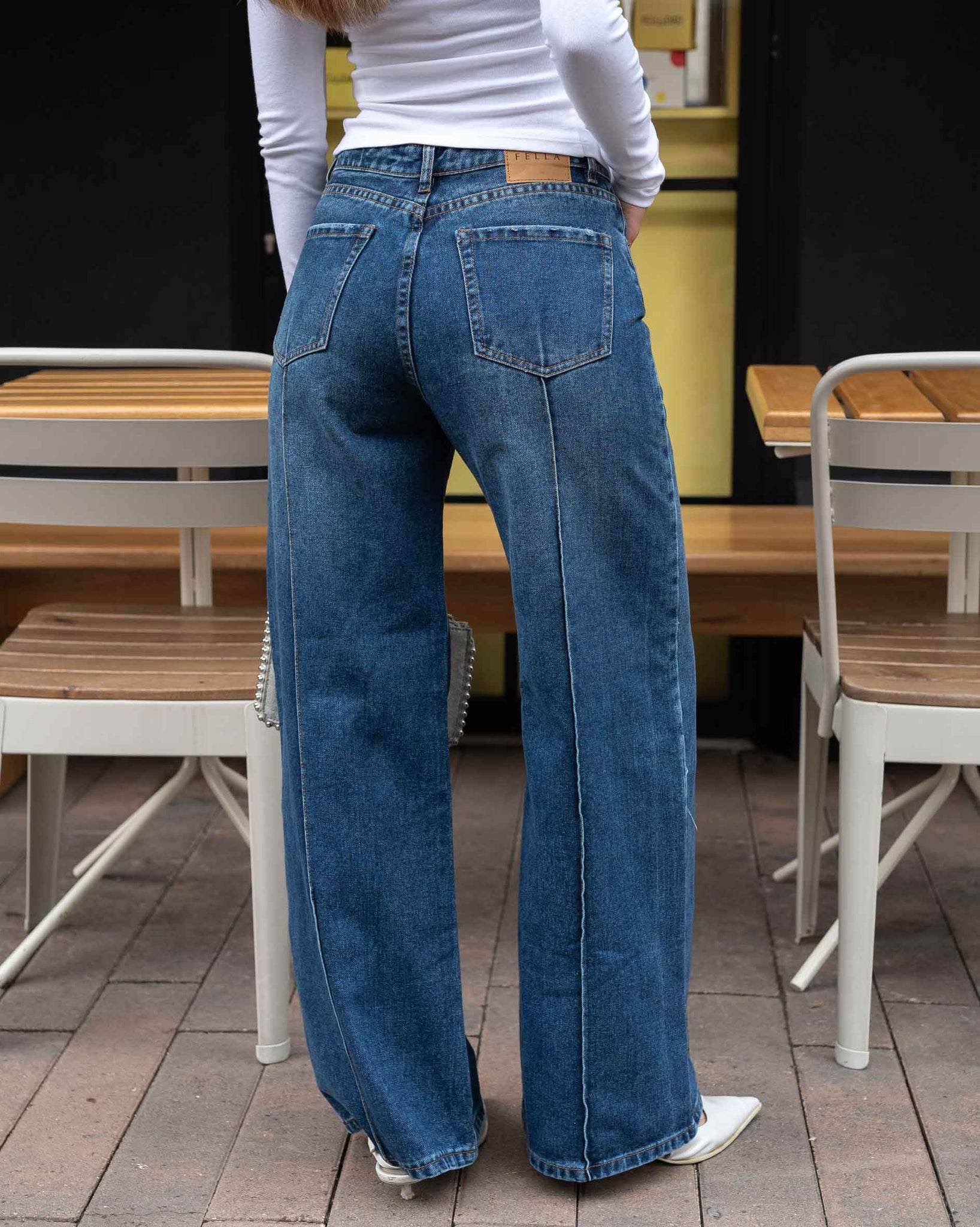Jean tiro alto en tela rígida, silueta tipo "wide leg". Ideal para armar tus outfits. Maria Fernanda usa un jean talla 8 y mide 1.72 cm.